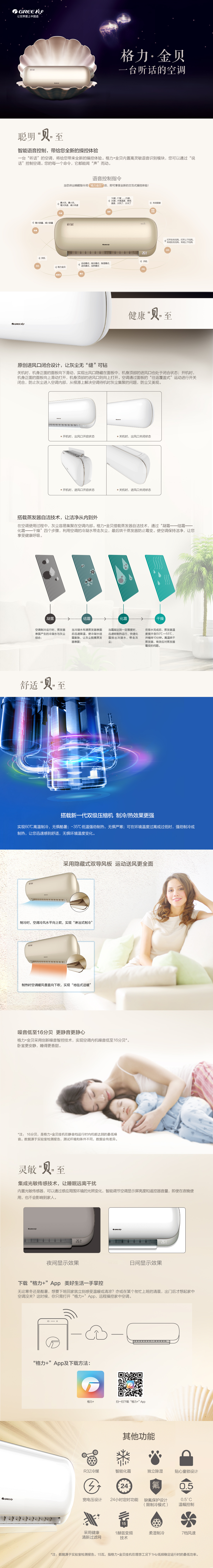 格力·金贝,一台“听话”的空调。圆润贝壳身形,化繁为简。原创进风口闭合设计,让灰尘无“缝”可钻,搭载智能语音控制技术,手控不如声控,让生活更简单。